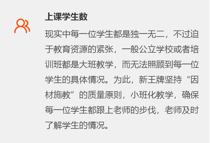 新王牌采用“小班化教学”形式,它的产生顺应了素质教育的需要,为学生提供了平等的受教育氛围,让受教育者能比较充分地享受教育资源。它具有大班教学无法比拟的优势:学生人数少使教育教学环节紧凑,能为学生提供更加广阔的自我表现,从而实现因材施教;